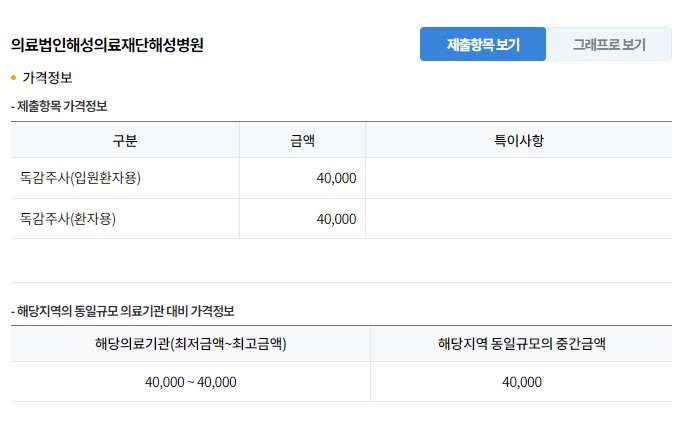 그러면 지역의 병원 정보를 확인하실 수 있고, 세부를 누르게 되면 각 병원 별 제출 항목에서 금액을 확인하실 수 있습니다. 달서구 이곡동의 의료법인 해성병원의 경우 4만 원에 접종이 가능하네요.