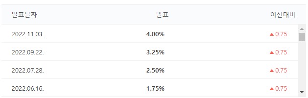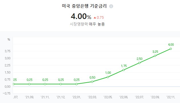 하지만 미국 중앙은행은 치솟는 인플레이션을 억제하기 위하여 이달 초 4회 연속 75포인트 금리 인상을 실행했고 아직 향후의 방향성은 예측하기가 어렵습니다.