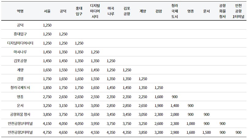 | 어른 | 어른운임(기준운임) = 기본임율 + 추가임율 ① 수도권 구간(서울역 ~ 청라국제도시역) - 기본임율 : 10km 까지 1,250원 - 추가임율 : 10Km 초과 5km 마다 100원 ② 독립운임 구간(청라국제도시역 ~ 인천공항1터미널역) - 기본임율 : 10km 까지 900원 - 추가임율 : 10Km 초과 1km 마다 130원 ③ 인천공항1터미널역 ~ 인천공항2터미널역 - 기본임율 : 10km 까지 900원 - 추가임율 : 10Km 초과 1km 마다 108.02원 |