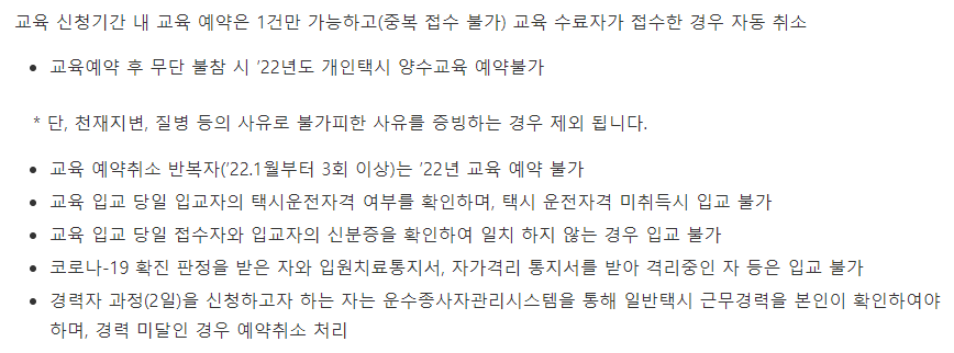 - 교육 수료일로부터 3년 이내에 시행규칙 제19조제9항에 따라 개인택시운송사업 면허를 양수하려는 자