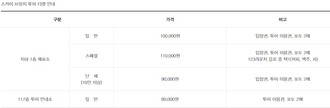 - 현장 예매 : 롯데월드타워 지하 1층 전망대 로비(개인 매표소, 단체 매표소 별도 운영)