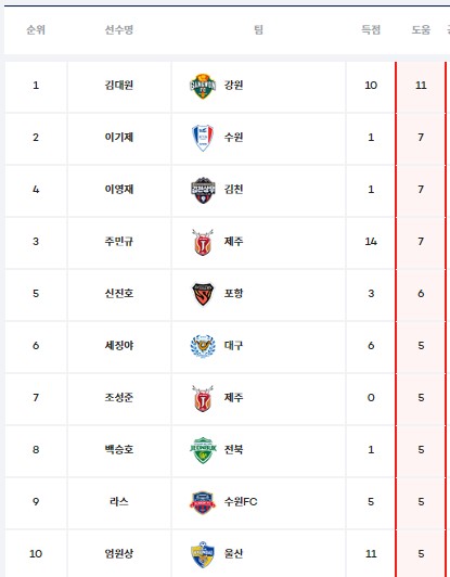 최용수 감독이 아끼는 강원의 김대원 선수가 11개로 1위입니다. 득점도 10골을 기록하면서 리그에서 유일한 10-10 클럽을 가입했습니다. 스탯이 아주 화려 하네요. 2위와의 격차도 많이 나기 때문에 도움왕은 거의 확실할 것 같고, 최고의 한 해를 보낸 선수가 아닐까 싶습니다.