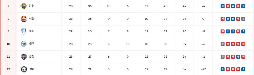 우승팀은 아무래도 울산과 전북 싸움이 되지 않을까 싶은데 울산이 유리한 건 사실입니다. 6~8위인 수원 FC, 강원, 서울의 경우 승점차 없이 촘촘하게 모여 있으며, 9위 수원, 10위 대구, 11위 김천은 K리그 2 2위 팀과 승강 플레이오프 걱정을 해야 되는 위치에 있습니다. 성남은 12위이지만 최근 5경기 2승으로 승점 6점을 얻었기에 마지막까지 누가 강등될지 모를 것 같네요.