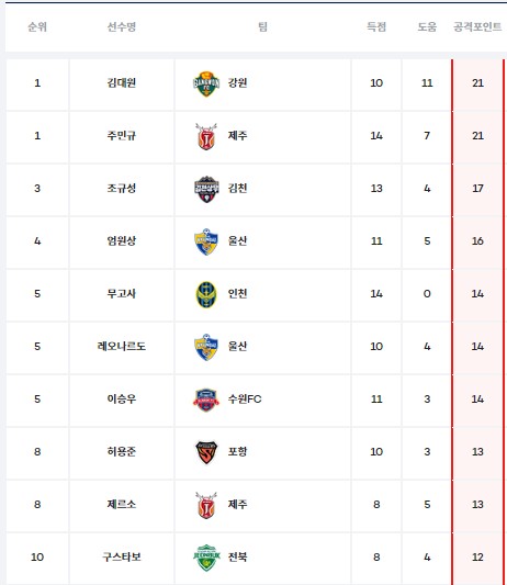 득점과 도움의 합인 공격포인트는 강원의 김대원, 제주의 주민규가 1위 싸움을 하고 있습니다. 두 선수가 거의 리그 MVP급 활약을 보여주고 있는데 마지막에 누가 웃을지 지켜보는 것도 재밌을 것 같네요.