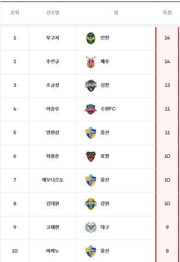 인천이 4위를 기록하고 있는 건 바로 이 선수 때문이죠. 인천의 무고사가 제주 주민규와 함께 총 14골로 1위를 달리고 있습니다. 수원 FC의 이승우가 11골로 4위를 기록하고 있는 점도 눈에 띄네요.