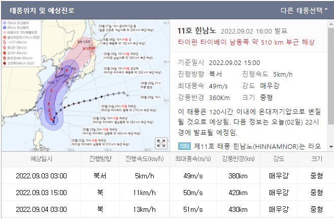 그런데 지금 우리나라로 북상 중인 11호 태풍 '힌남노'는 이보다 강한 초속 50미터 이상이라고 하는데 제발 경로를 바꾸고 우리나라에 별다른 피해가 없었으면 좋겠네요. 하지만 현재까지의 11호 태풍 힌남노의 예상 경로가 좋지는 않습니다.