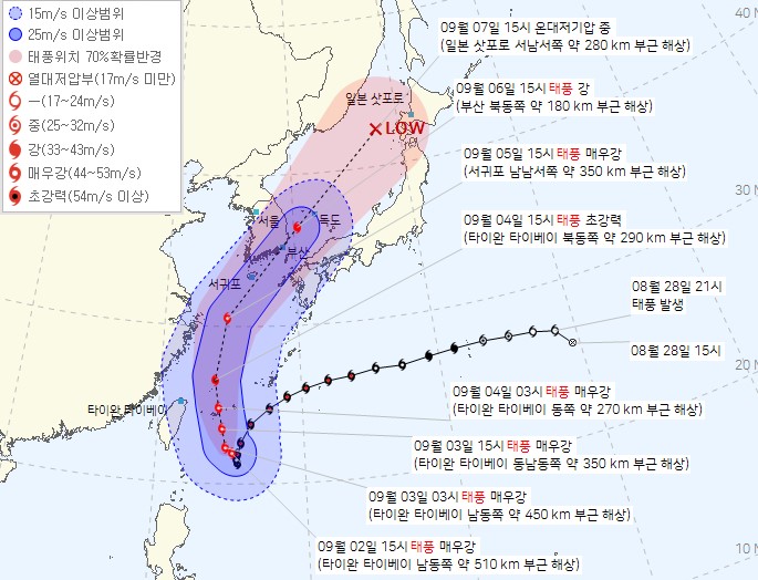 9월 5일 15시경 제주 서귀포 남남서쪽 약 350 km 부근 해상에서 매우 강력한 상태로 접근할 예정입니다. 아마 5일부터 우리나라도 영향권에 들어갈 것 같으며, 9월 5일 15시 ~ 9월 6일 15시 사이가 가장 위험한 시기가 아닐까 싶네요.
