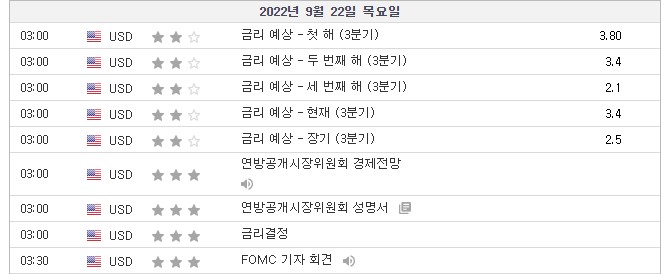 FOMC 일정 : 현지시간 9월 21일(수) 오후 2시, 한국시간 9월 22일(목) 오전 3시