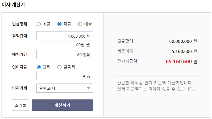 적금 계산기는 네이버, 구글, 다음 등 주요 포털에서 쉽게 사용하실 수 있습니다. 예금은 아주 간단합니다. 연 4%의 이율이라고 했을 때 초기 예금의 4%로 계산하면 되지만, 적금의 경우 적립식으로 납입하는 경우가 많고, 월별로 계산이 됩니다. 즉 4%의 적금이라고 했을 때 첫 달에 넣은 금액은 12개월을 은행에 맡기는 것이기 때문에 4%의 이율을 받지만, 두 달째 넣은 금액은 11개월만 은행에 예치되기 때문에 계산이 달라집니다.